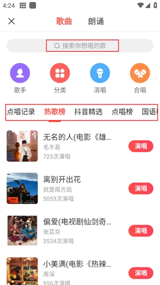 之后就能进入歌曲朗诵界面,下方有热歌榜、抖音精选等各类歌曲可供挑选,也可以点击上方搜索框,输入自己想录制的歌曲。
