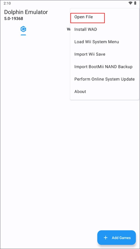若想把手机里的游戏导入进来,第一步可以点击右上角三点菜单里的“Open File”,或者直接点击右下角的“Add Games”按钮。