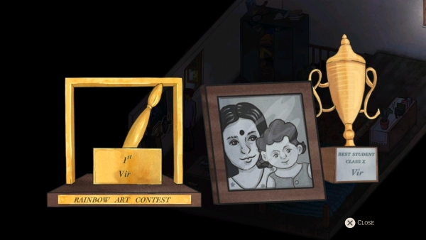 踏入游戏剧情,在房间内展开探索,床头摆放着儿时与母亲的合影。