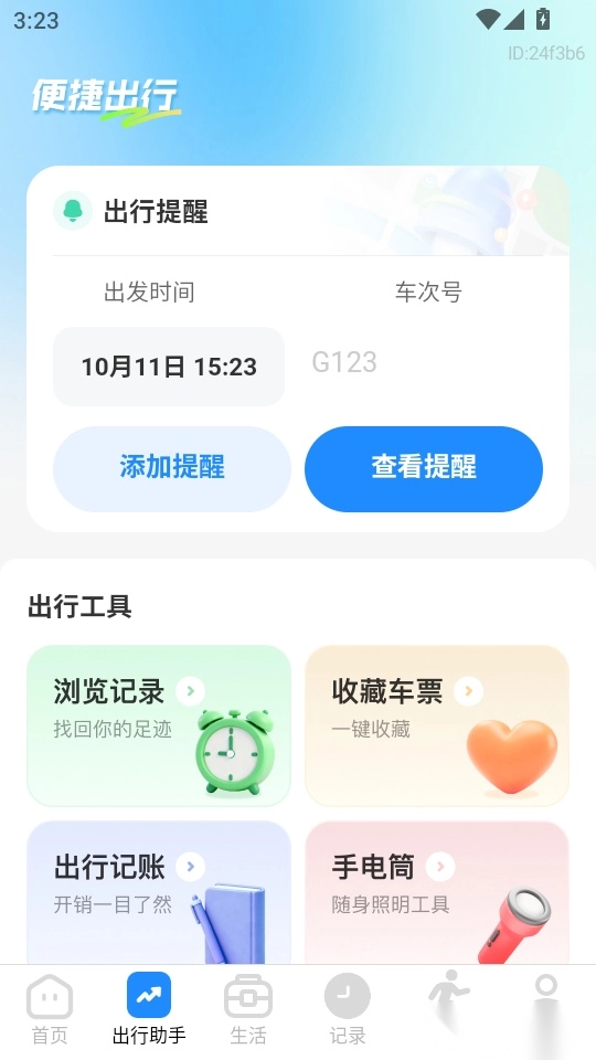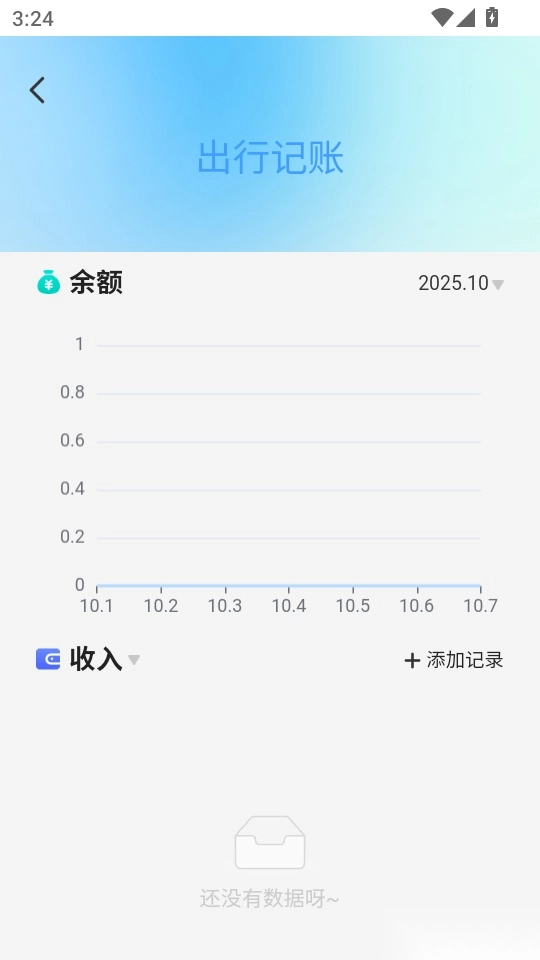 然后找到“出行记账”模块下方的“+添加记录”功能按钮,点击进入。