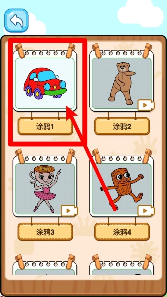 关卡选择:图册里呈现了多幅涂色作品的预览图,点击“涂鸦1”这类卡片就能进入创作界面,还能解锁更多题材,大家可以根据自己的喜好自由挑选进行涂色。