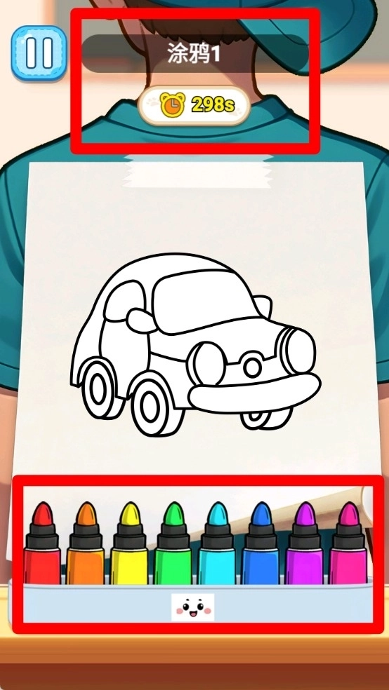 涂色界面的布局如下:顶部区域展示当前关卡和剩余倒计时,左侧设有暂停功能按钮,中间部分呈现小汽车的线稿图案,下方的彩笔选择栏可供用户挑选颜色,点击对应区域即可完成上色操作。