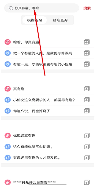 把对方发来的文字复制粘贴到搜索框里搜索,接着就能得到有趣又合适的回复内容,再把回复复制发送给对方,这样就完成互动了。