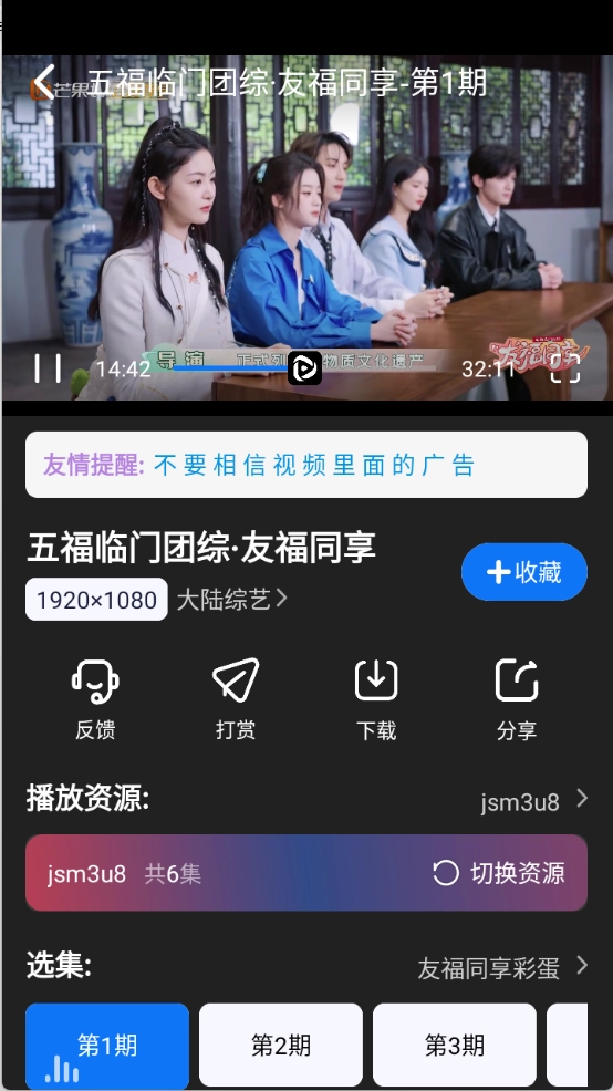 用户点击心仪的影视资源后,只需选定集数与播放源,就能开始观看了。