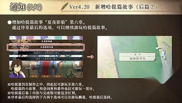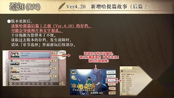 版本更新后,若读取哈提篇后篇1发布前(即Ver.4.10版本)的存档,可能会出现图片与文字显示混乱的情况。对此给您造成的不便,我们深感抱歉。如果您读取旧版本存档时遇到故障,建议通过【章节选择】界面继续游玩后续内容。