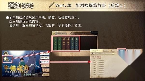要是您此前已经体验过序章版、麟篇以及哈提篇后篇1,并且希望马上开启后续的游玩内容,那么可以使用【解除剧情锁定】功能和【章节选择】功能。