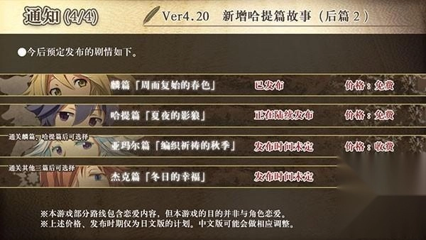从当前的v4.20版本信息来看,麟篇已经正式完结,玩家可以免费体验该篇章的所有内容;哈提篇目前正在分阶段更新发布,待全部内容上线后也将开放免费体验;至于亚玛尔篇和杰克篇,则暂列于后续的更新规划中,具体发布时间尚未确定。需要说明的是,这两个篇章的日文版本或许会采用收费机制,而中文版可能会根据实际情况进行相应调整。
