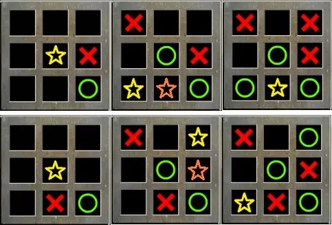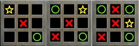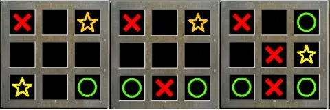 向右转三次,然后点击密码器。这个密码器的设计原理是井字棋游戏,你作为先手方,只要能在棋盘上让三个相同的标记连成一条直线,就能成功解锁。