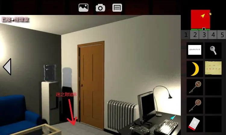 向右转三次,拿走花盆旁边的【橙色碎片】。再向左转三次,走下楼梯,进入1楼东走廊。