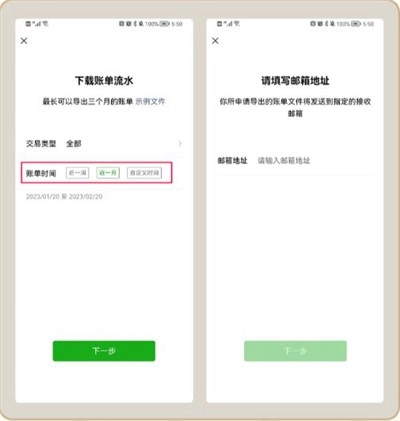 先选定需要导出账单的时间范围,接着点击下一步,再填写接收账单的邮箱,之后点击下一步。