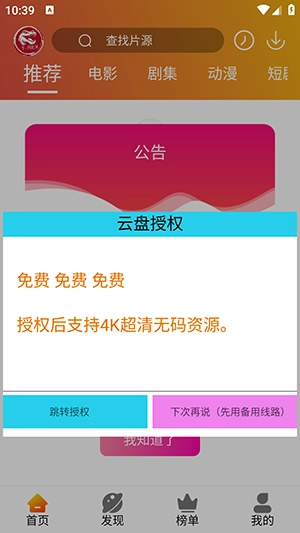 手机安装并打开后,会弹出“云盘授权”的提示,此时点击“跳转授权”即可;若不进行授权,软件将无法自动获取网络上分享的阿里云盘资源。