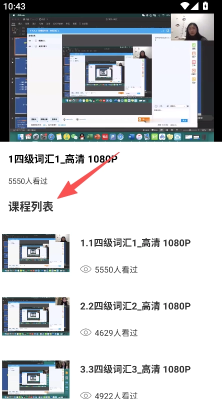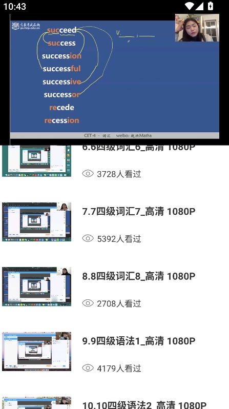 课程以列表形式呈现,每个条目都标注了观看人数,内容涵盖四级词汇、语法等,点击相应条目即可查看完整课程内容。