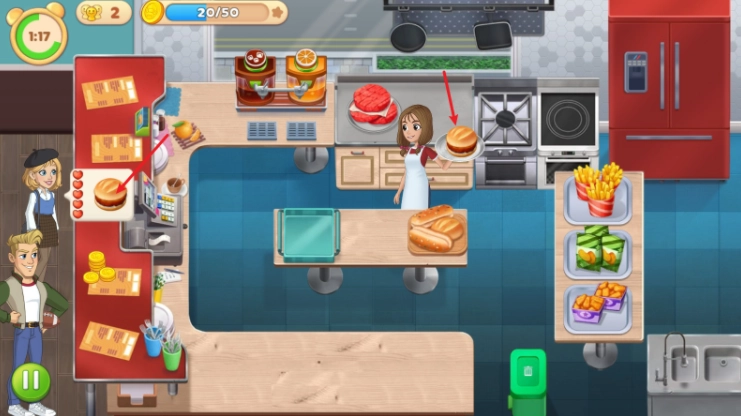 制作主食汉堡要稍微复杂一点,得先点击肉饼进行煎制,之后再点击面包,这样就能制作完成了。