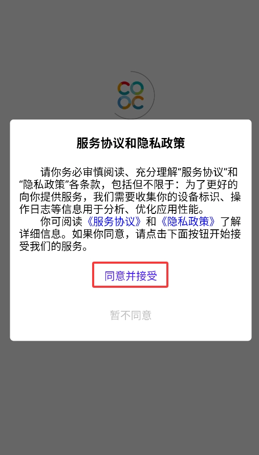 应用首次启动时,需点击弹窗里的同意选项,才能进入主界面开始使用。