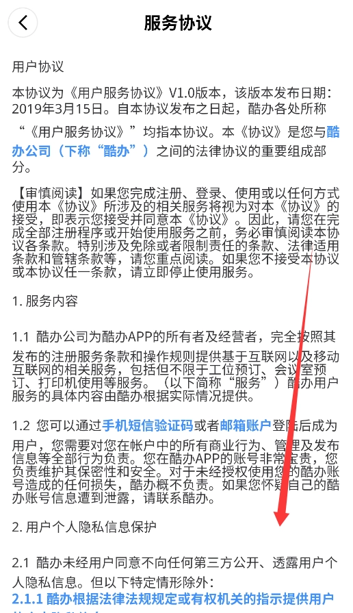 仔细阅读服务协议内容,向下滑动浏览全部条款细则。