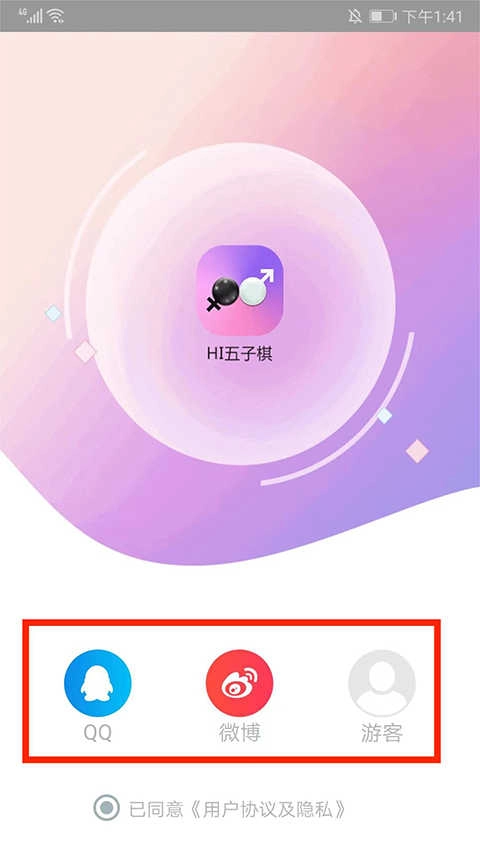启动Hi五子棋后,你可以选择用QQ或微博账号登录,也能以游客模式进入游戏。