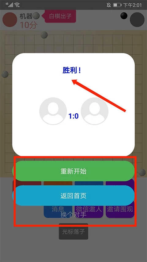 6、运用你的策略思维,在棋局中率先达成五子一线即可赢得胜利。对局结束后系统将显示胜利提示,并可选择重新开始、返回主页或更换对手。
