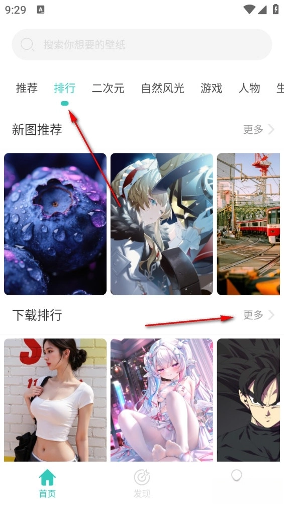 在首页就能浏览到排名靠前的壁纸,要是想查看具体排行,点击上方的“排行”按钮就行;若想了解所有排名情况,点击“更多”便能查看完整榜单。