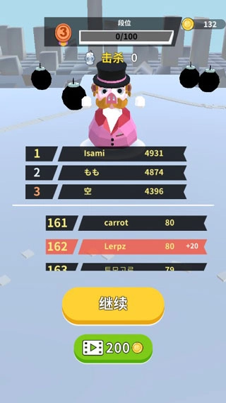 游戏玩法:在战场中移动拾取随机掉落的炸弹,借助灵活的走位与辅助虚线,对其他敌人展开猛烈轰炸,直到仅剩下1人成为最终胜利者,该胜利者将获得大量段位点数。