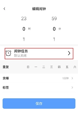 用户可在闹钟便捷页面设置闹钟的响铃时间、重复日期、标签等信息。点击“闹钟任务”即可进入下一步操作。