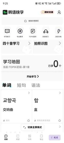 韩语快学是一款为韩语学习者量身打造的全能型学习工具。不管你是刚入门的韩语新手,还是正在备战韩国语能力考试的进阶学习者,又或者是打算去韩国旅行、工作或生活的用户,韩语快学都能为你提供全方位的支持。这款工具包含了丰富多样的学习模块,像词库、阅读、词书、笔记以及题库等都应有尽有。