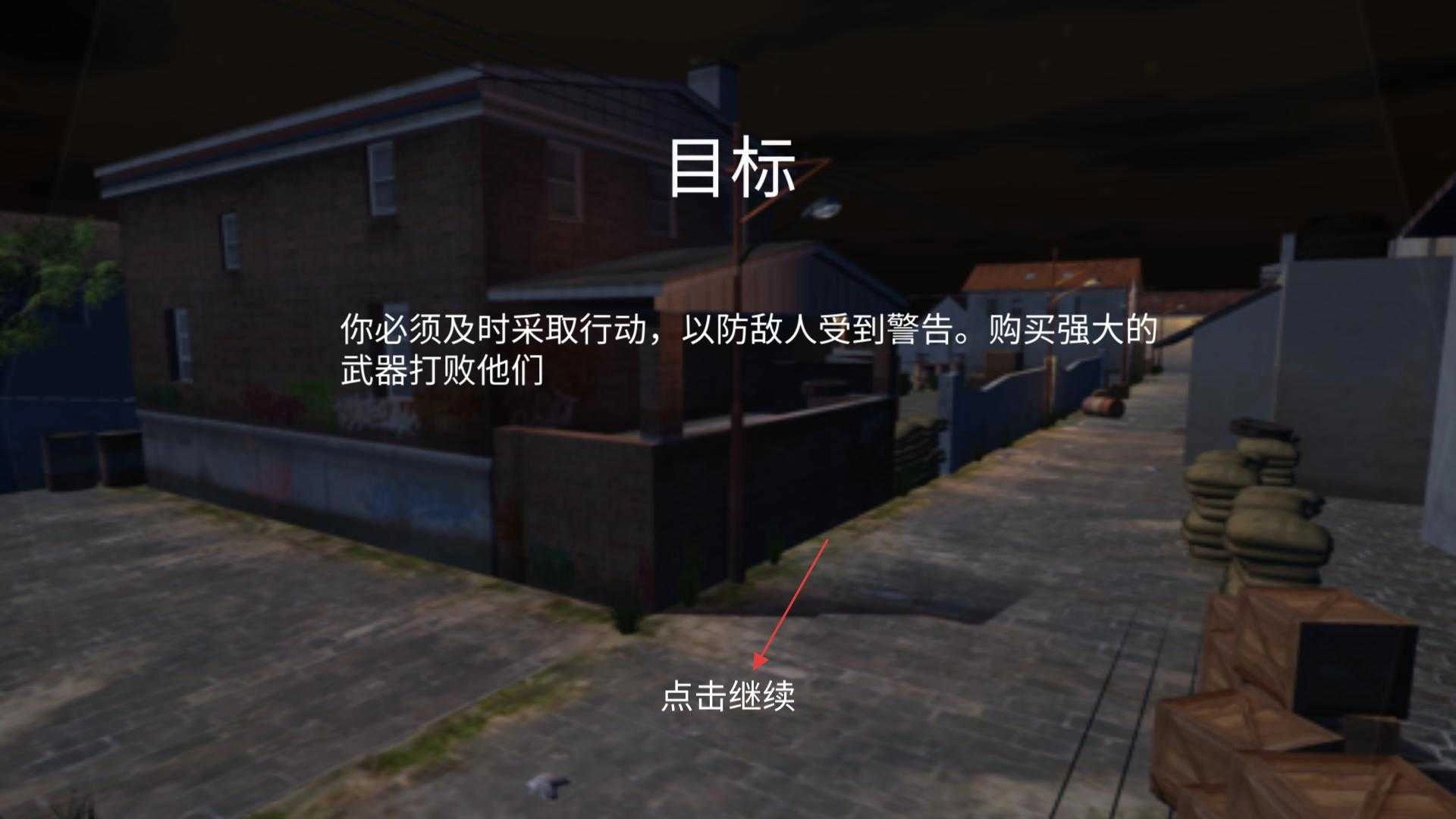 在目标提示界面,你可以看到任务目标的具体说明,提示需要及时采取行动以避免敌人发出警告,还需要购买强力武器来击败敌人,点击“继续”按钮即可进入游戏场景。