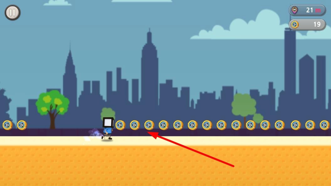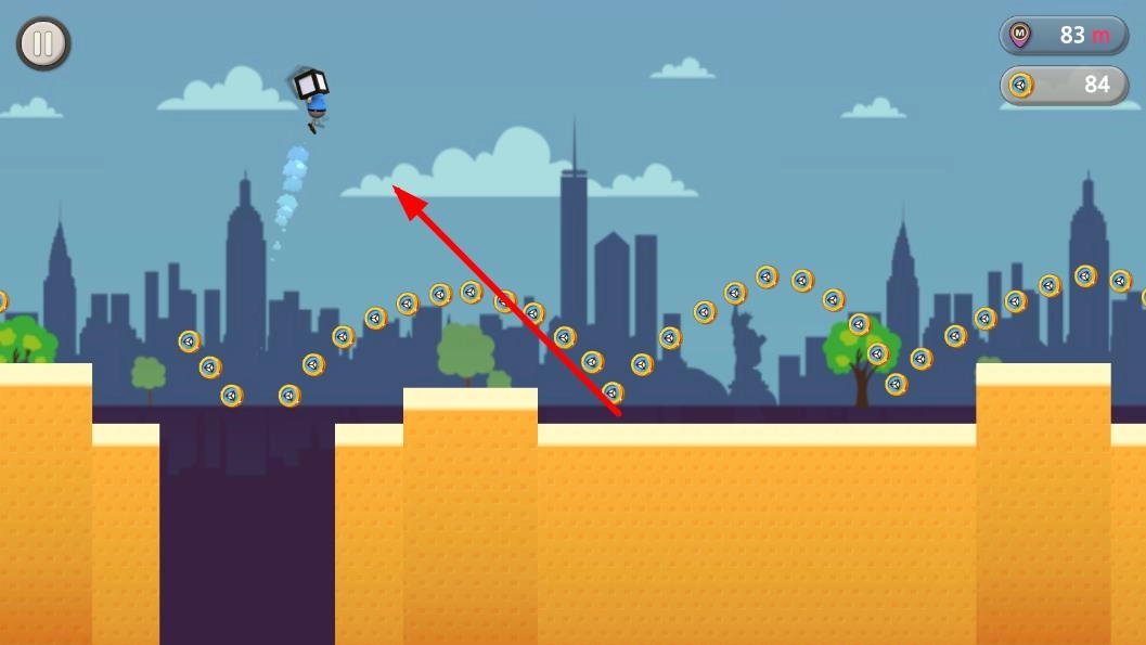 你需要在建筑之间连续跳跃,碰到空隙时可以用空中双跳,躲开障碍同时收集金币,尽量跑过更多的建筑物。