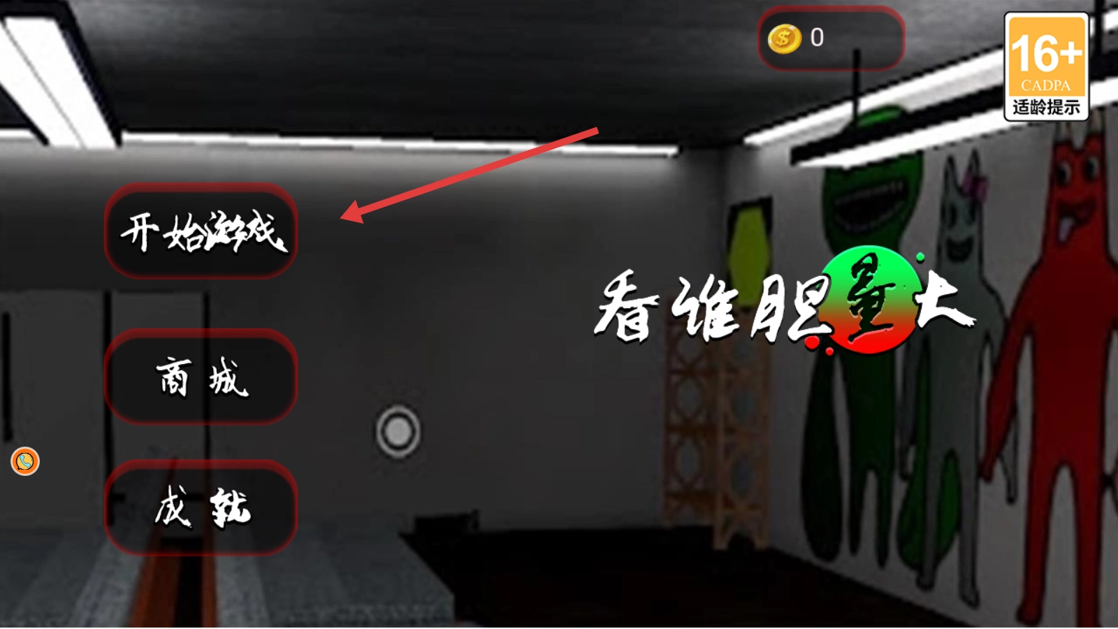 主界面设有开始游戏按钮,点击此按钮后,便会进入地图选择环节,从而开启“看谁胆量⼤”的冒险流程。