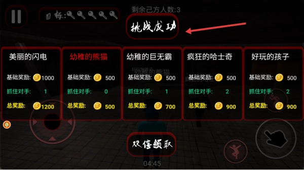 完成关卡后会显示挑战成功的提示,届时可以查看包括幼稚的熊猫在内的角色奖励,还能选择点击领取金币或是通过特定方式双倍获取金币,以此来推动游戏进度的前进。