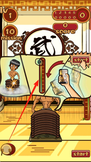 功夫劈砖是一款借助重力感应技术打造的特色劈砖游戏。在这里,你可以化身为修炼铁砂掌的阿龙或者阿兔,置身于复古街机风格的场景之中,只需晃动手机,就能施展劈砖的绝技。在充满趣味的切磋过程中,不断挑战连续劈碎砖块数量的上限。游戏以像素画风展现出层层堆叠的砖块阵列,从古朴的红砖,到坚硬的钢筋混凝土砖,甚至还有带有金属夹层的复合砖块。而且,每次晃动手机时的力度与角度,都会实时对砖块碎裂的物理效果产生影响。