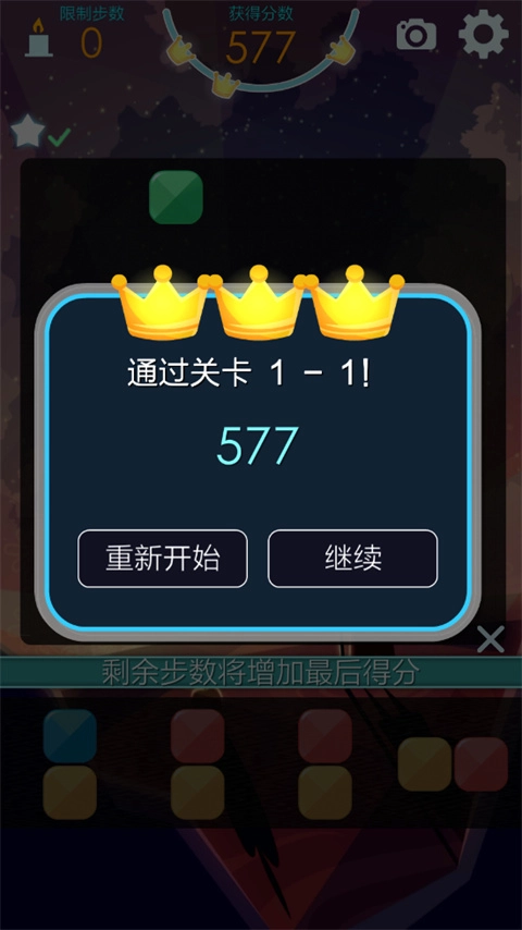 每个关卡的通关目标各不相同。在进入关卡前,会显示我们需要消除的方块的颜色与数字,同时还有规定步数。你务必在规定步数内完成任务才行。