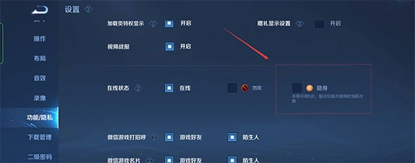 3、功能/隐私往下拉找到在线状态,有在线、勿扰、隐身三个选择,玩家选择隐身即可。