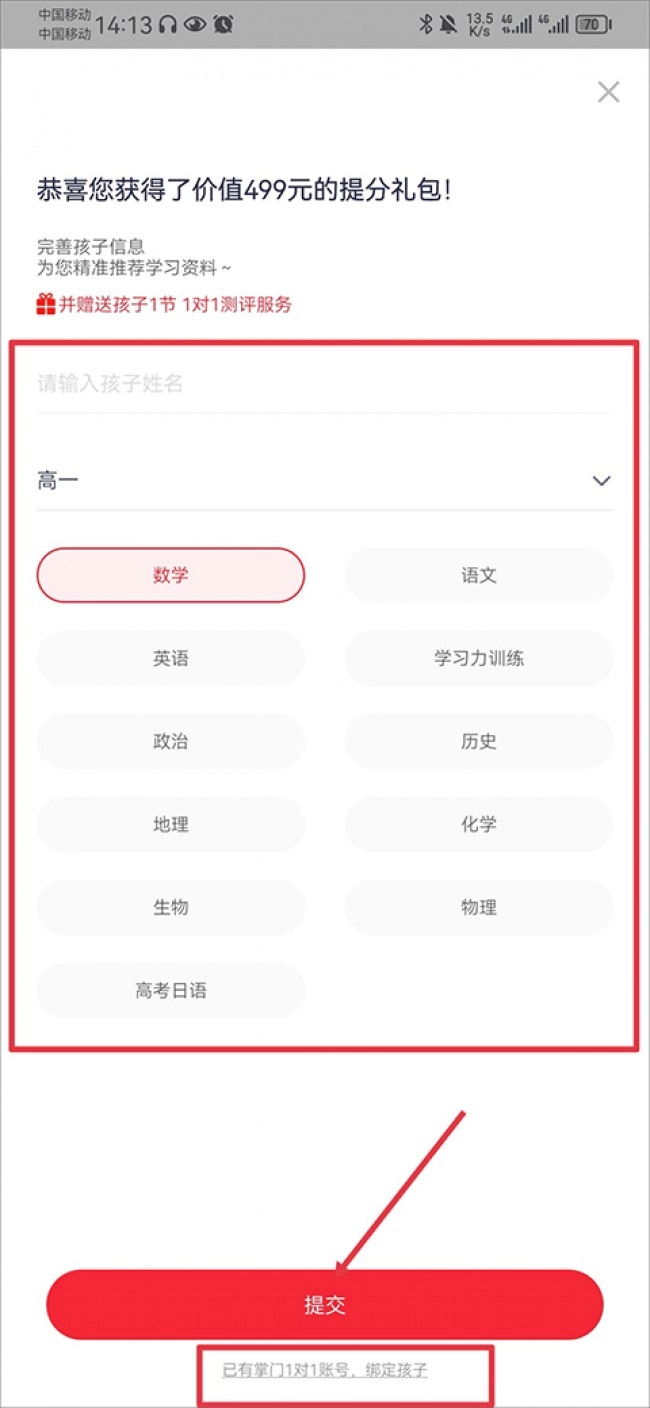 2、选好小孩的名字、年级及课程后,点击提交。若小孩已有帐号,可点击下方帐号,与小孩进行绑定。