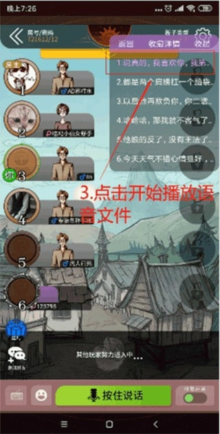 4. 当语音包处于播放状态时,在游戏中点击麦克风并【按住说话】,此时房间内的所有人都可以听到语音包所发出的声音。