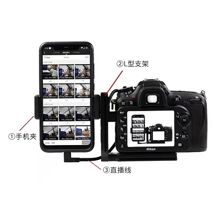 一部安卓手机,一台相机,一条照片直播数据线,还有一个用于固定相机和手机的手机支架。