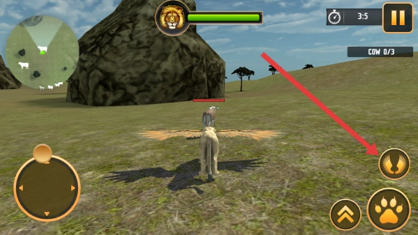 3、轻点右侧的翅膀图标,使狮子张开翅膀翱翔,飞行过程中能无视地形,迅速靠近目标牛,同时要留意右上角的计时器。