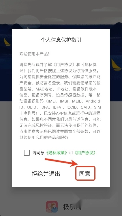 用户打开app后,首先需点击“同意”,以同意软件协议政策。