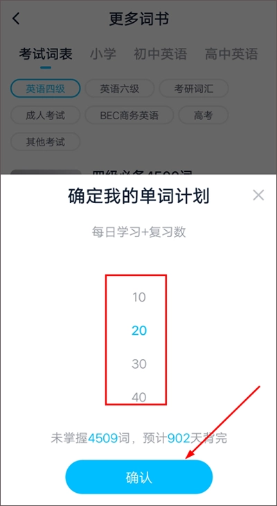 2、进入【更多词书】页面后,依据自身需求挑选打算背诵的单词数量。