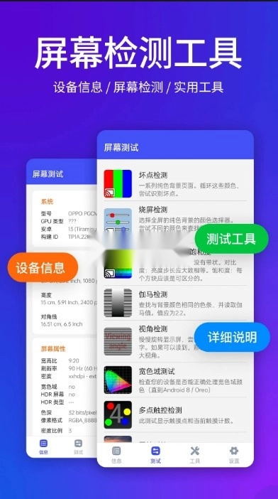 《屏幕测试app》是一款极为专业的屏幕检测软件,它能助力用户对设备显示屏的质量进行检测与评估。通过这款软件,可确保屏幕不存在坏点,色彩精准无差错,而且触控功能也能正常运行。此外,用户还能够查看手机的各类详细信息。有需求的小伙伴们,赶紧来下载体验一番吧!