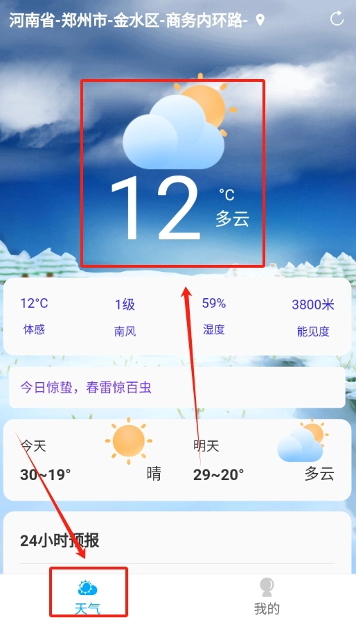 2、若想了解今天一整天的天气变化情况,在软件中即可查看24小时内的天气预报,以便随时做好相应准备。
