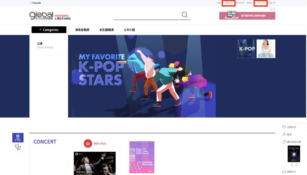 国际版网址:http://www.globalinterpark.com