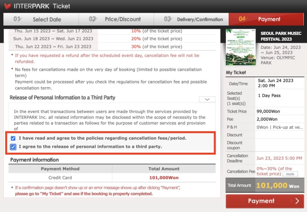 确认时间、票价以及退费方式均无问题后,便可勾选同意条款,点击「Payment」进行结账。