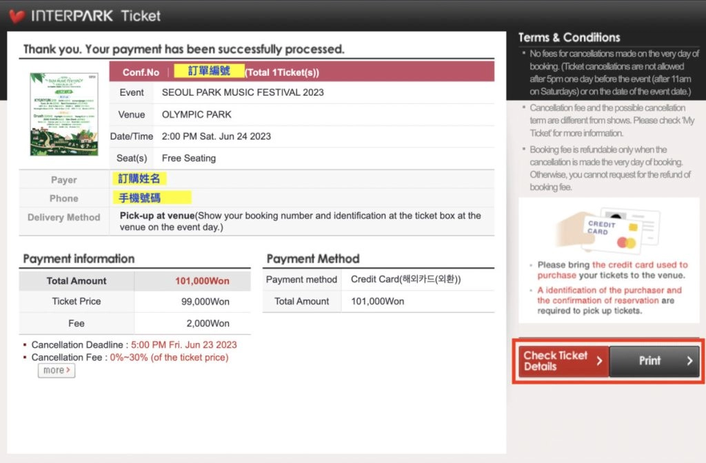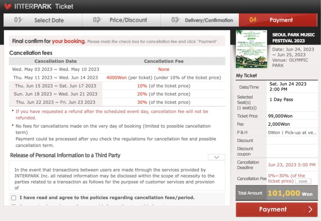 在Interpark进行付款操作时,会历经层层确认流程,并且到最后还会再次对退票相关的时间与规定予以提醒。