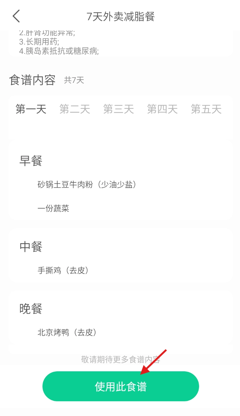 3、查看食谱:在食谱板块中,点击你感兴趣的食谱,即可查看其介绍、每日计划、人气以及健康程度。