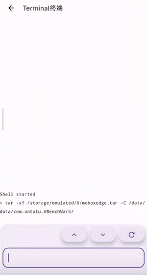 解压 /storage/emulated/0/moboxedge.tar 这个压缩包,并将解压后的文件放置到 /data/data/com.antutu.ABenchMark/ 目录下 。命令为:tar -xf /storage/emulated/0/moboxedge.tar -C /data/data/com.antutu.ABenchMark/ 。