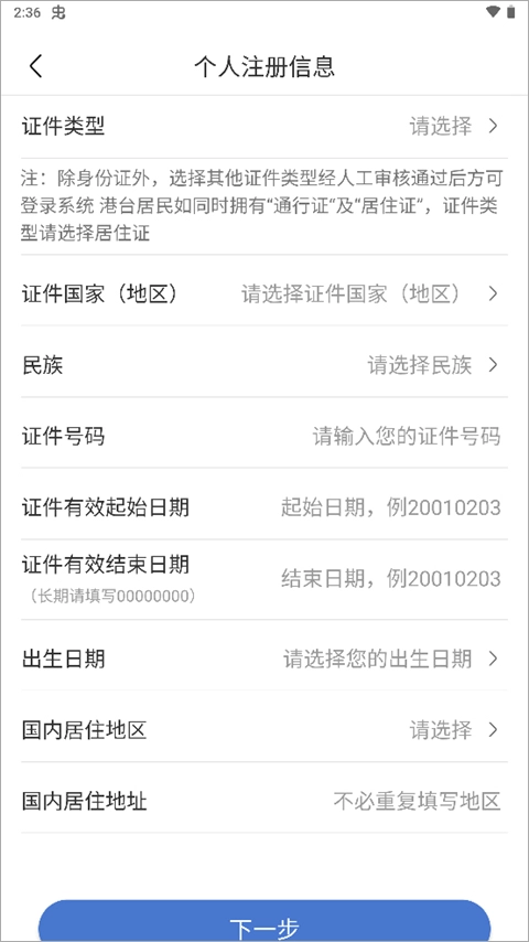 2. 点击个人注册选项,依次填入密码、验证码等相关信息。
