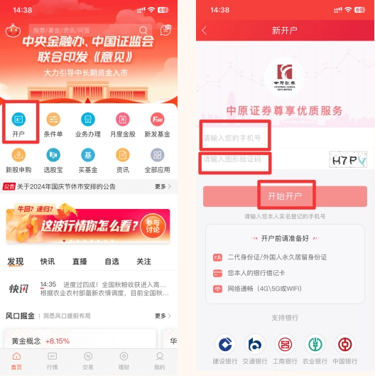 完成开户流程之后,能够通过“中原证券财升宝APP - 首页 - 开户”入口,输入手机号码以及验证码,从而及时知晓开户是否成功。
