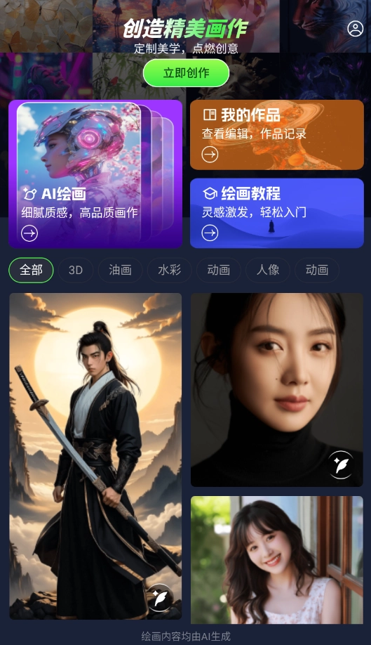 3、在掌握基础之后,进入AI创作界面,从风景、人物等绘画类型中挑选一种,进而开始生成作品。