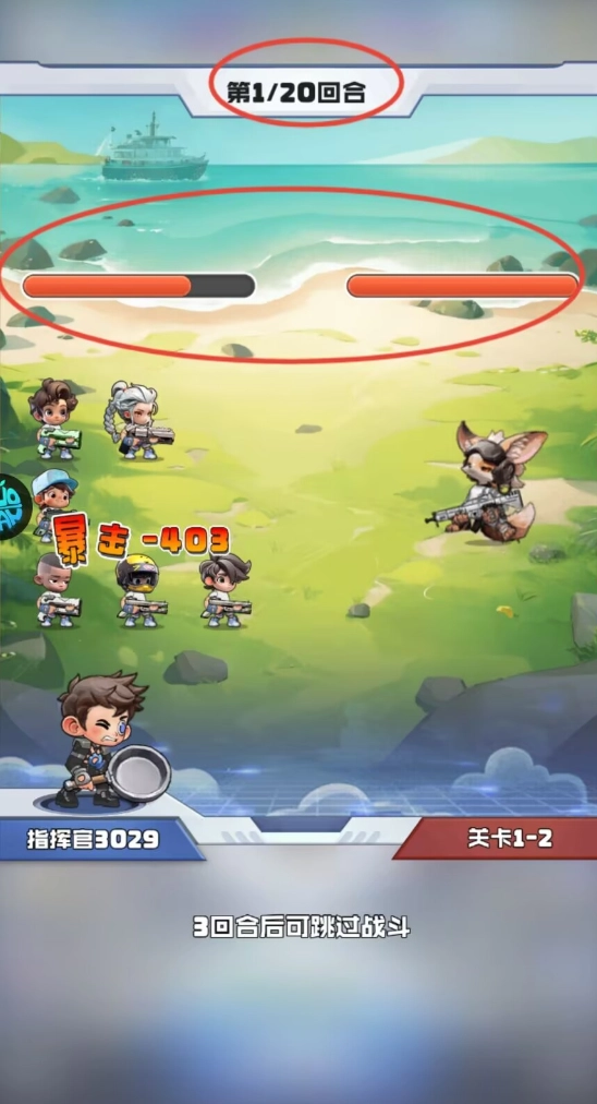3、战斗以自动回合制展开,界面顶端实时呈现敌我双方的血量以及回合进展情况,而在右下角则会标明当前关卡的难度等级。