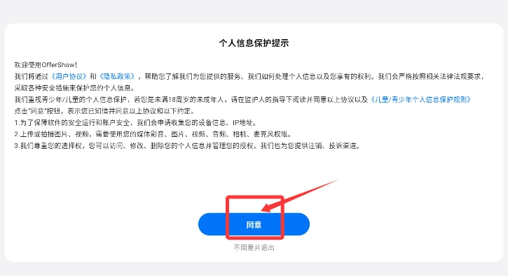 1. 首次使用时,请仔细阅读隐私保护说明,确认无问题后,点击“同意”方可进入。